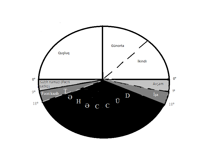 Rəsmdən də görüldüyü kimi; Gecə və gündüzün hər biri üç bölümə ayrılır. Bunların ən uzun bölümlərində fərz namazı yoxdur. Gündüzün birinci bölümü günəşin doğmasıyla, təpə nöqtəsinə gəldiyi vaxtdır. İkinci bölüm, Günəşin meylindən ikindiyə, üçüncü ikindidən günəş batana qədərdir.